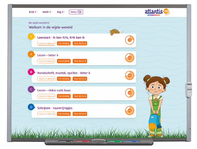 Bij elk onderdeel van de dag hoort een volledige digibordles. Naast die lessen vind je in de software de algemene handleiding, lesvoorbereidingen, observatiemateriaal, letterfilmpjes, leerliedjes én een handig digitaal planbord voor hoeken- en groepswerk.